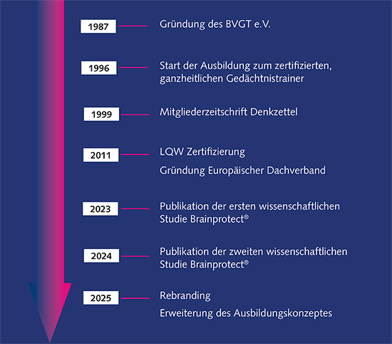 1996 begannen die Ausbildungen zu zertifizierten Gedächtnistrainerinnen und - trainer, die das Herzstück des Verbands darstellen. Diese Trainerinnen und Trainer bieten nun seit Jahrzehnten in allen Ecken der Bundesrepublik Gedächtnistraining an und unterstützen so unzählige Menschen darin, ihre geistige Fitness zu verbessern oder zu erhalten.